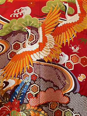 The sight of the cranes taking flight against the vermilion red fabric and the pine, bamboo, and plum blossoms is very graceful.